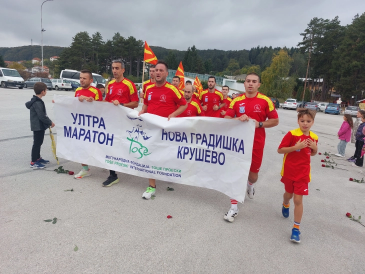 Со 500 рози, тага и сеќавања крушевчани ги пречекаа 12-те ултрамаратонци кои денеска пристигнаа во Крушево, на Гумење каде е вечното почивалиште на Тоше Проески, македонската и балканска ѕвезда, големиот човек и хуманитарец.