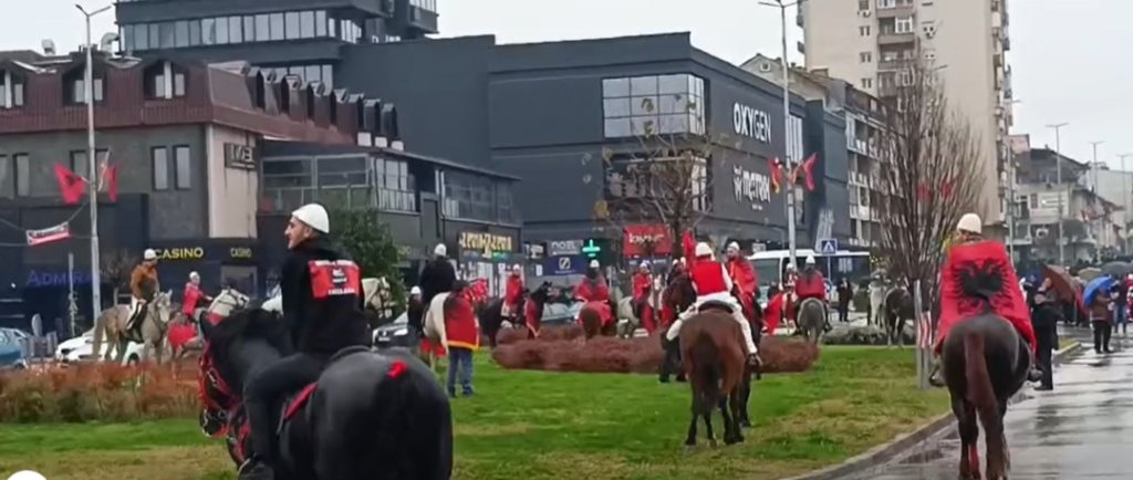 Албанци на коњи и со албански знамиња го блокираа сообраќајот на улиците во центарот на Тетово, славејќи го денот на албанското знаме – 28 ноември.