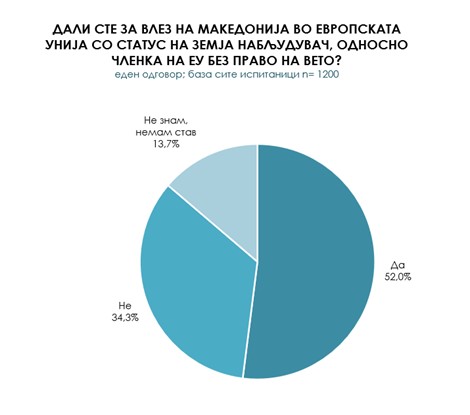На прашањето поврзано со евроинтеграциите, 52 отсто од испитаниците изјавиле дека се за влез на Македонија во Европската Унија како членка без право на вето, односно со статус на набљудувач.