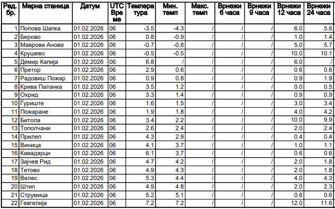 Според табелата која ја објави УХМР до 7 часот утринава најмногу дожд има наврнато во Гевгелија и тоа 12 литри на метар квадратен дожд. Во исто време најладно со измерени -4 степени беше на Попова Шапка а 7 степени беа измерени во Гевгелија.