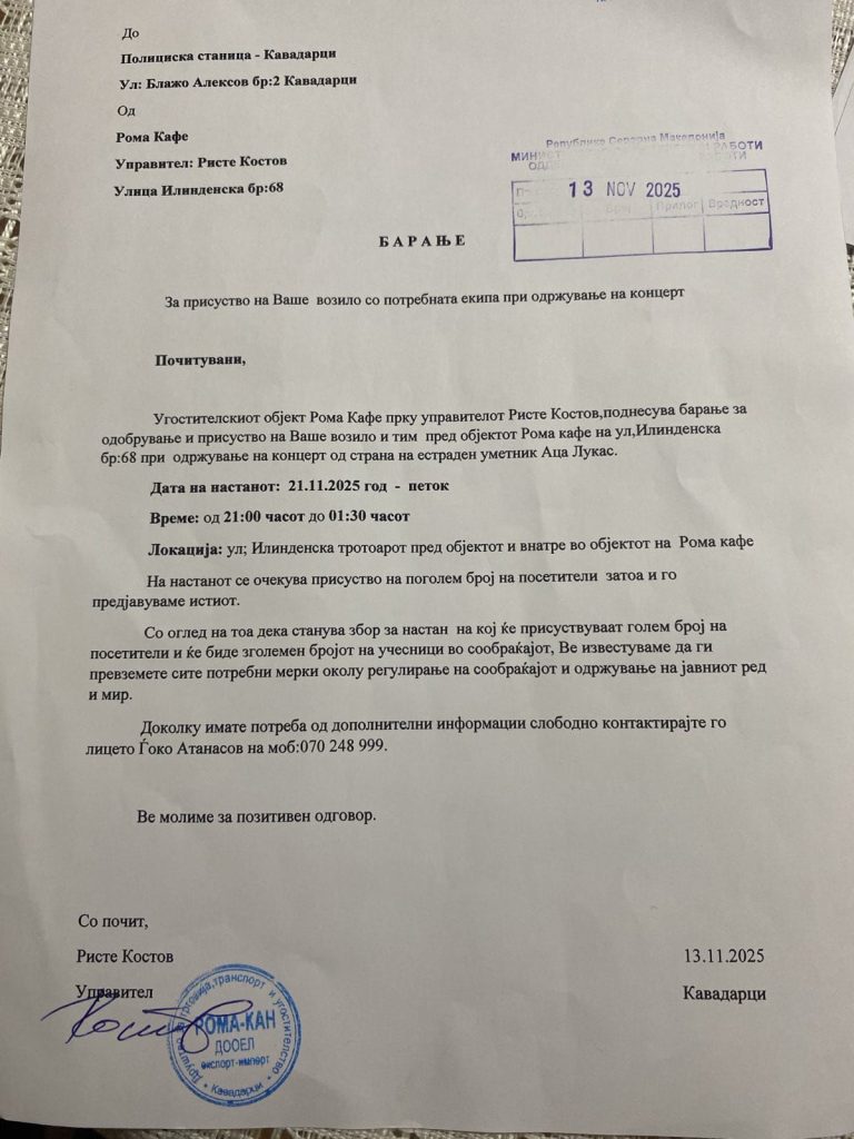 24инфо.мк во продолжение екклузивно го објавува барањето поднесено од страна на управителот на кафулето Рома а доставено до полициската станица во Кавадарци.