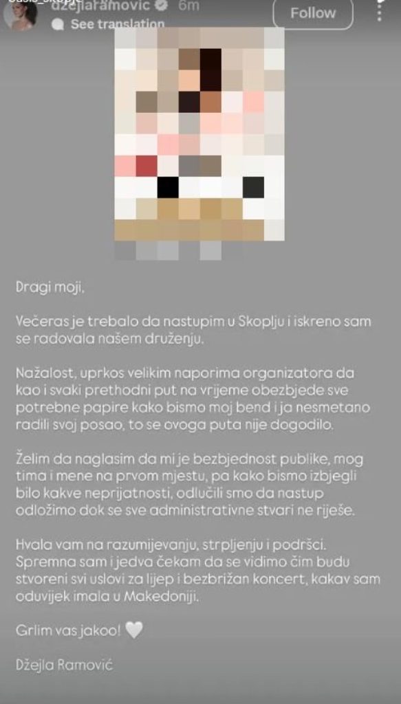 Пејачката се огласи на Инстаграм, објаснувајќи дека организаторите не успеале навреме да ги обезбедат сите неопходни документи. Таа истакна дека безбедноста на публиката, нејзиниот тим и неа самата е на прво место, поради што била донесена одлука да се избегнат нови потенцијални непријатности.