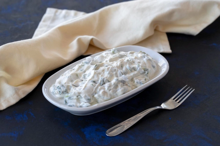 Сирењето убаво изгмечете го со вилушка, па додајте ги киселите павлаки и добро измешајте додека да добиете кремаста смеса.