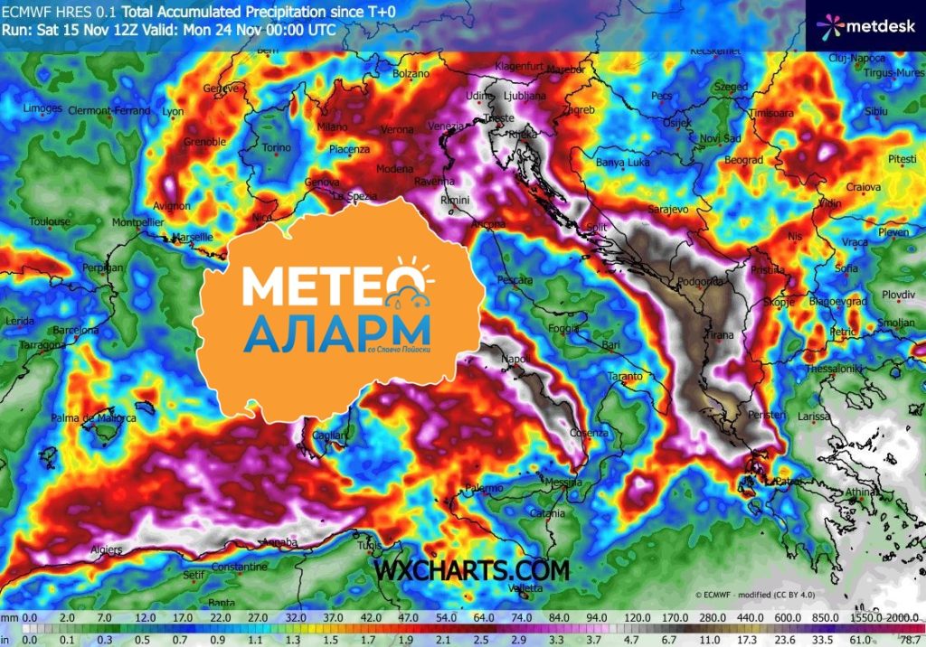 Од вторник (18 Ноември) па се до крајот на следната седмица нашата Република Македонија и целиот регион ќе бидеме под влијание на низок воздушен притисок односно циклонски систем со центар над Џенова. Токму поради ова од запад во нашата Македонија во вторник ќе се прошируваат обилни врнежи од дожд кои ќе бидат проследени со засилен повремено силен ветер од јужен правец (повремено и локално со брзина од над 70 км/час). Локално врнежите ќе бидат проследени и со појава на грмежи а овие процеси би можеле локално да бидат застапени и во форма на невреме.