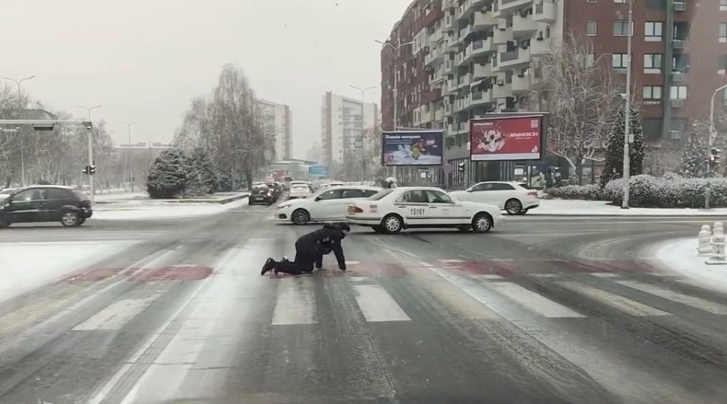Необична и во исто време загрижувачка сцена денеска го обиколи Скопје. На булеварот „Јане Сандански“ во скопската општина Аеродром, граѓанин беше забележан како ползејќи се обидува да го помине коловозот, поради екстремно лизгавиот и неисчистен снег.