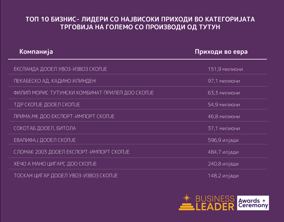 Анализата на Бизнис Мрежа покажува дека најголемите десет компании во категоријата трговија на големо со производи од тутун имале силна 2024 година: заеднички приход од околу 452,6 милиони евра, вкупна добивка од околу 18 милиони евра, а сето тоа изведено со 965 вработени. Топ-тројката по приходи држи речиси 69 насто од целиот колач, што говори за висока концентрација и јасно лидерство на врвот.