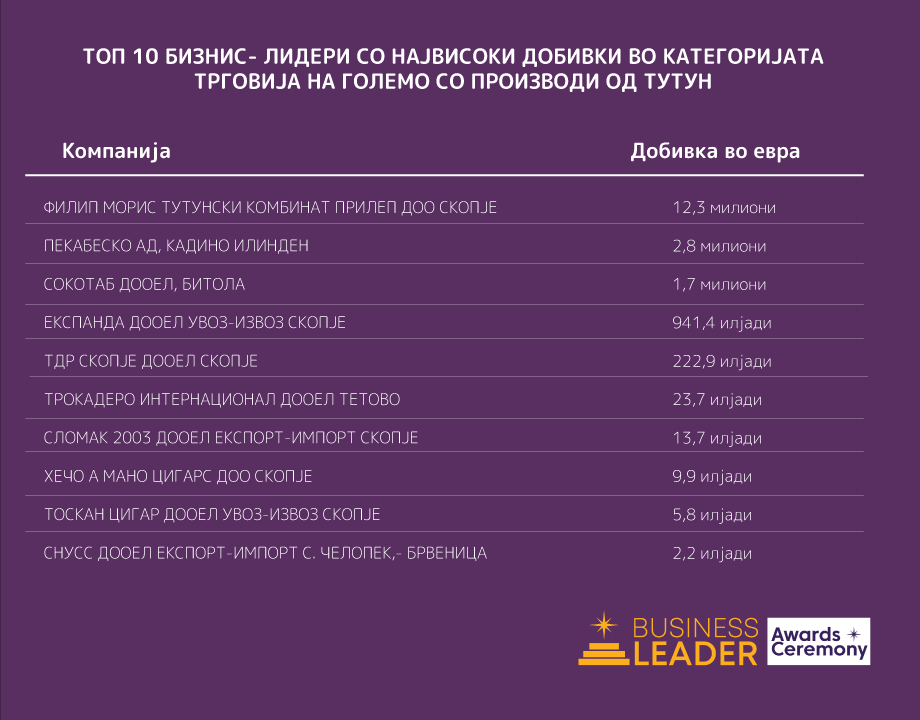 На врвот по профит е Филип Морис ТК Прилеп – ДОО Скопје со 12,3 милиони евра, односно 9,5 милиони евра пред второпласираниот Пекабеско, чиј остварен профит од ланското работење е 2,8 милиони евра. Трет е Сокотаб – Битола со 1,7 милиони евра. Само овие три компании имаат годишен ќар што се мери во милиони евра, а добивките на останатите седум компании се бројат во илјади.