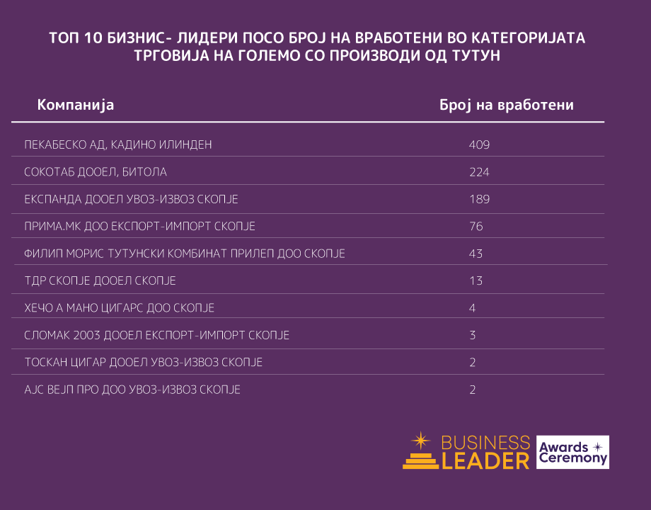 Индустријата ја движат луѓето, и тоа се гледа по концентрацијата на кадарот кај врвот. Во топ десетте компании работат вкупно 965 лица, а само три компании апсорбираат над 85 насто од тимовите: Пекабеско со 409 вработени, Сокотаб – Битола со 224 и Експанда со 189 вработени лица. Тоа е јасен потпис на бизнис во кој логистиката, складиштата и теренската продажба се мускулите што носат обем.
