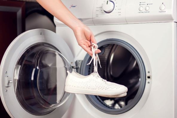 Потоа, чевлите ставете ги во заштитна мрежа и наполнете го барабанот со неколку постари крпи, кои ќе ги ублажат ударите при вртењето. Изберете блага програма за перење, без топла вода, и вклучете дополнително плакнење за целосно да се отстранат остатоците од детергент.