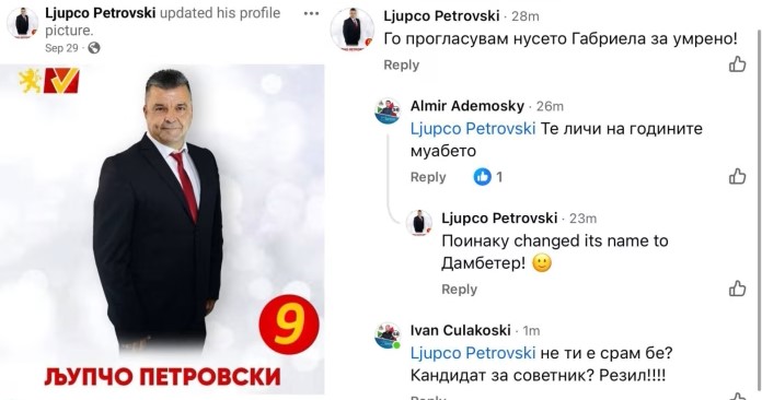 Инцидентот се случил под објава на актуелниот градоначалник и кандидат на ВМРО-ДПМНЕ, Тони Коњановски, каде Петровски напишал: