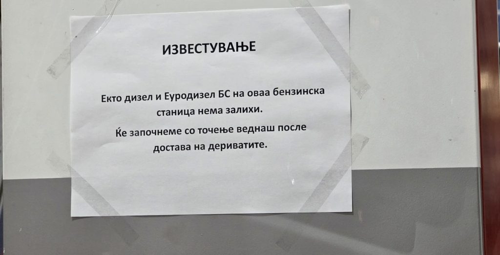 „ИЗВЕСТУВАЊЕ: Екто дизел и Еуродизел БС на оваа бензинска станица нема залихи. Ќе започнеме со точење веднаш после достава на дериватите.“