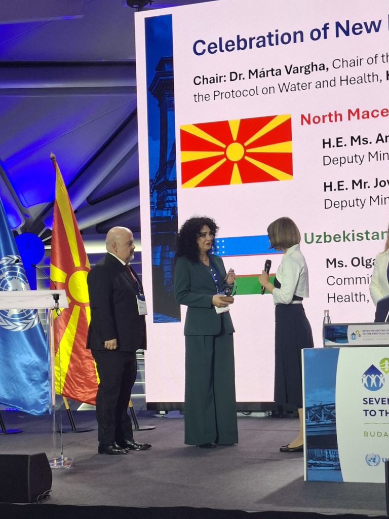 Заменик-министерката за животна средина и просторно планирање, Ане Лашкоска, и заменик-министерот за здравство, Јовица Андовски, учествуваа на високиот сегмент на Седмото собрание на страните на Протоколот за вода и здравје, организирано заеднички од Економската комисија на Обединетите нации за Европа (UNECE) и Регионалната канцеларија на Светската здравствена организација за Европа (WHO/Europe), по покана на Владата на Унгарија.