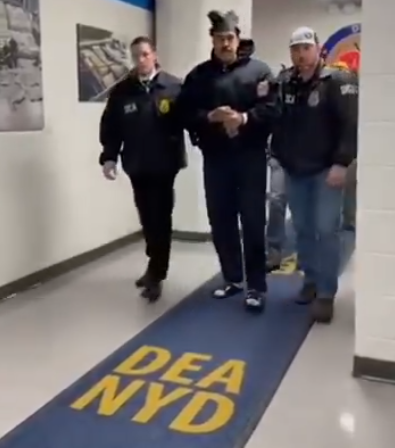 На социјалната мрежа Икс се појави видео на кое се гледа Мадуро облечен во црна маица со качулка како оди по ходник со син тепих со натпис „DEA NYD“. Тој е со лисици на рацете, придружуван од агенти на ДЕА, и се обидува да поздрави на англиски со зборовите „Добра ноќ“ и „Среќна Нова Година“.