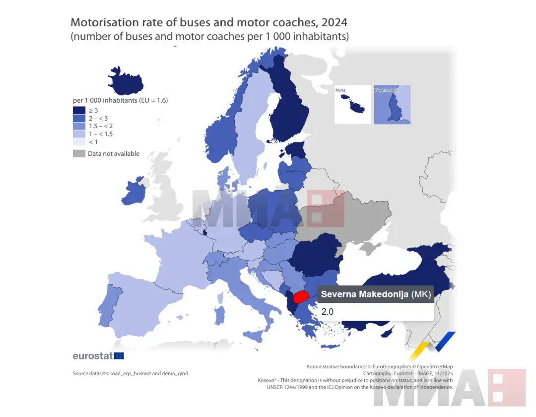 Во просек, 5,1% од возниот парк на автобуси и моторни автобуси е обновен низ цела ЕУ во 2024 година, додека Македонија со 379 нови автобуси во 2024 година има обнова на возниот парк од 10,2 проценти.