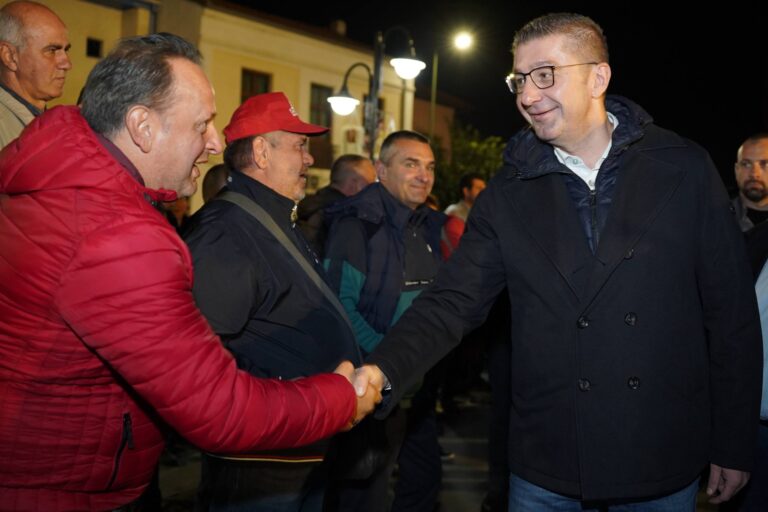 „Нивниот дом за кој се борат се бизнисите, тендерите, зделките во четири очи, фабриките за марихуана, желбата да се профитира на нечесен и криминален начин. И знаат дека со секој глас повеќе, со секоја поддршка повеќе за нас, тие се готови, а така го гледаат во очи нивниот  политички крај. А политичкиот крај значи и соочување со она од што најмногу се плашат, а тоа е правдата. Сето ова за што ви зборувам, драги мои, можевте да го видите на филмска лента во изминативе две и пол недели од оваа  кампања за првиот круг на овие локални избори. Сосема извесно е дека со еден избор одите напред, а со друг се враќаме назад. Сетете се само на оние 7 години кога влада беа СДСМ и ДУИ. Со еден избор се борите за твоето маало, за твојата општина и заедничката иднина, а со другиот се борите за нивните лични интереси. Затоа на овие избори е пресудно и клучно најпрвин да излезете да гласате“, рече Мицкоски.
