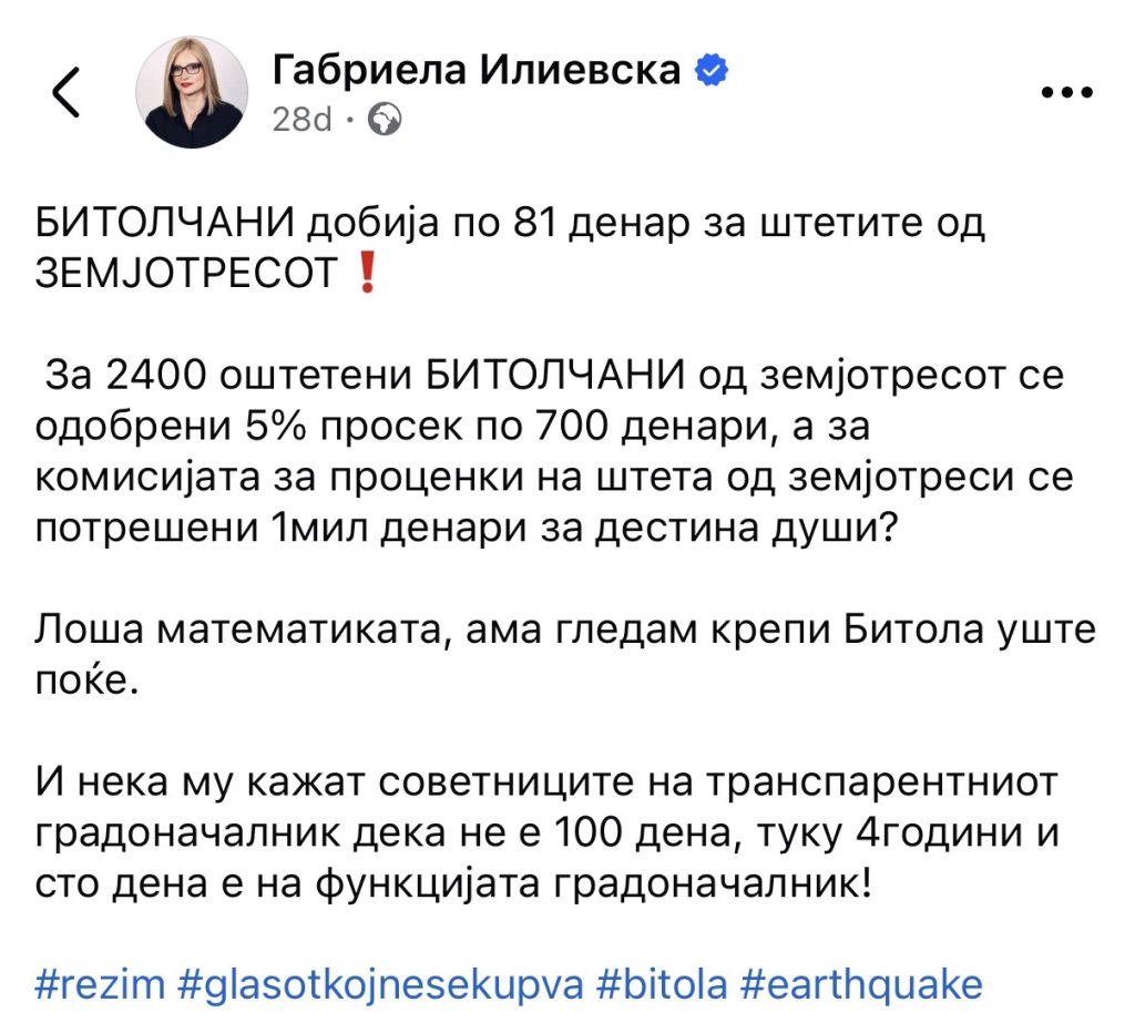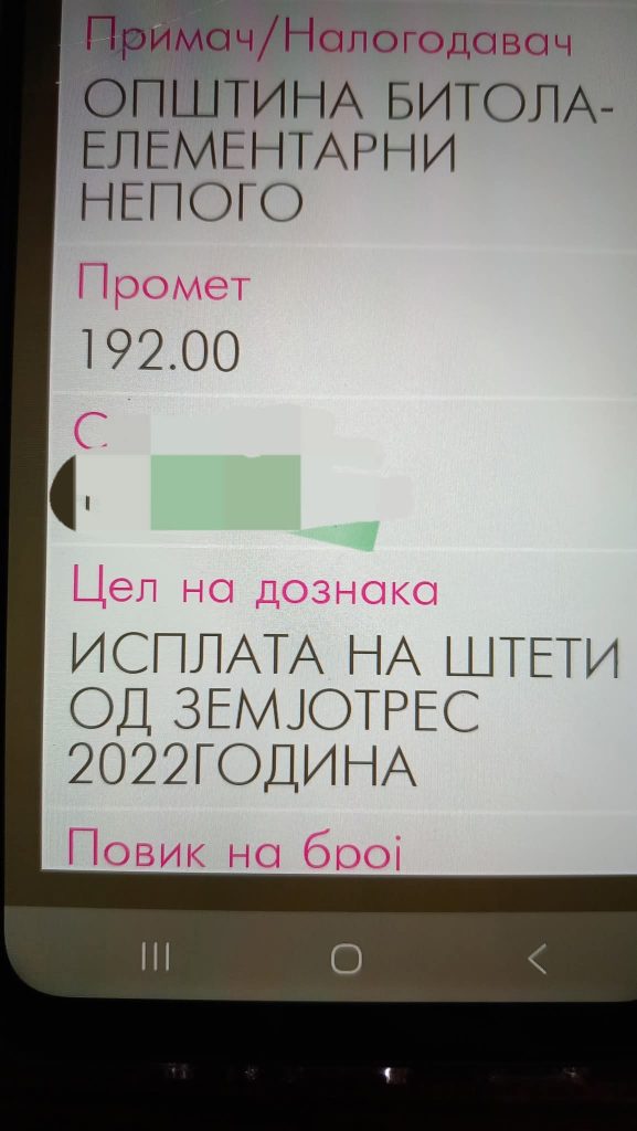Реакциите во јавноста не стивнуваат откако дел од битолчани деновиве почнаа да ги добиваат исплатите за штетите од земјотресите што го погодија градот во јануари 2022 година. Според сведоштва на граѓани, на нивните сметки биле исплатени симболични износи – некои добиле 81 денар, други 192, а дел и по 357 денари, што предизвика револт и бројни реакции на социјалните мрежи.