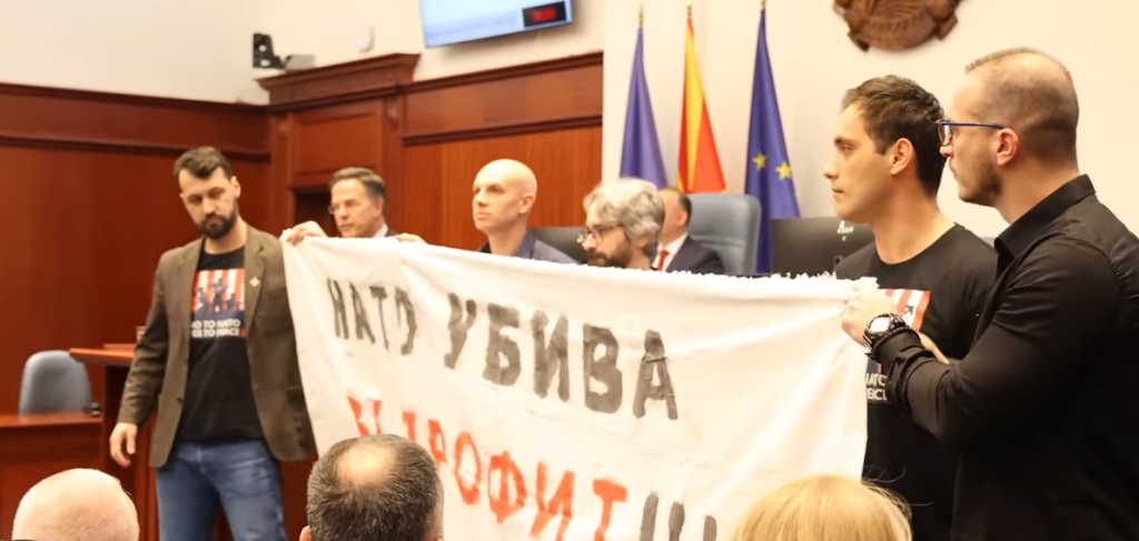 Пратениците на Левица излегоа со транспарент „НАТО убива за профит“ додека генералниот секретар на организацијата, Марк Руте говореше во Собранието.