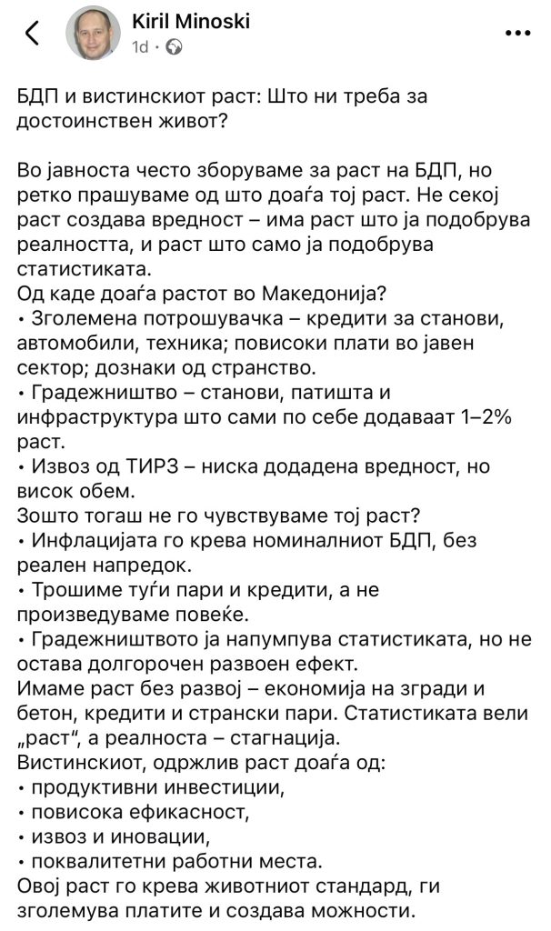 Поранешниот министер за финансии Кирил Миноски во нова објава на Фејсбук укажува дека македонската економија бележи статистички раст, но без вистински развој кој го подобрува животниот стандард на граѓаните. Тој поставува клучно прашање – од каде доаѓа растот на БДП и зошто тој не се чувствува во секојдневието?