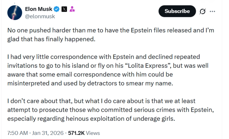 Тој истакна дека е свесен дека дел од преписката може погрешно да биде протолкувана, но оти тоа не го загрижува. Маск додаде дека силно се залагал за објавување на документите за Епстин и нагласи дека е важно кривично да се гонат оние кои сториле тешки кривични дела, особено во случаите на сексуално искористување малолетнички.