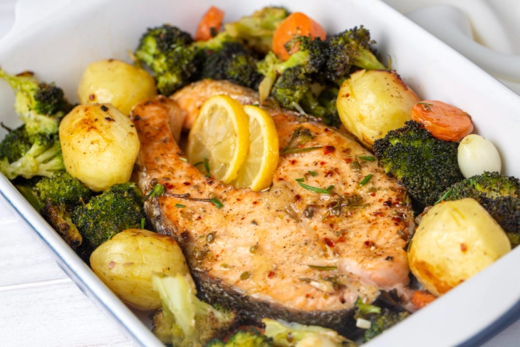 Ставете хартија за печење на дното од тавата и ставете ја рибата, посолете и печете на 200 степени. Измијте го зеленчукот (брокула, моркови, компири) и печете ги посебно, само да биде полусварено. Кога рибата ќе биде полусварена, наредете го зеленчукот околу неа и додадете масло. Измешајте го со масло лукот и магдоносот и додадете го лимунот и оцетот, премачкајте ја и рибата и зеленчукот со него. Вратете го во рерна да се зарумени.