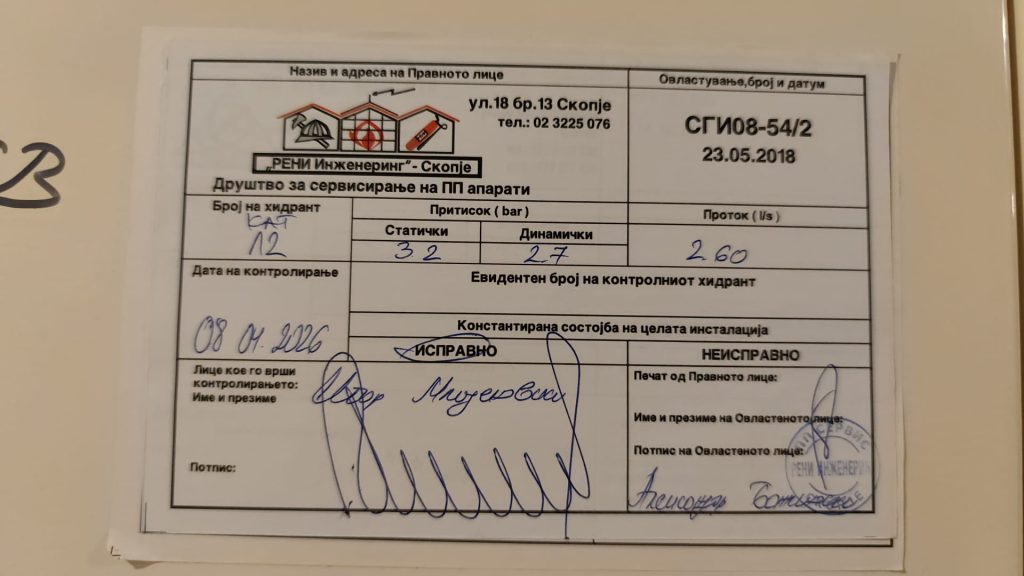 Истовремено, уште истиот ден, на сите противпожарни апарати во кула Д (објект од 40 ката со 400 станови) беа поставени нови контролни лепенки со кои се потврдува дека опремата е „исправна”, со датум на извршена контрола 08.04.2026 година, датум кој во моментот на поставување на лепенките сè уште не беше и не е настапен.