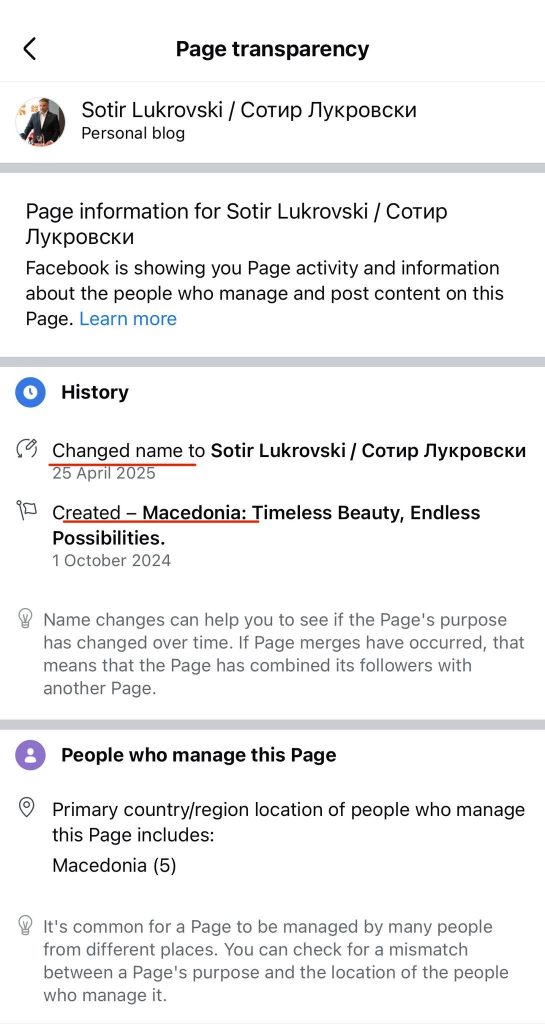 Но, само неколку месеци подоцна – на 25 април 2025 година, истата страница го сменила името во „Sotir Lukrovski / Сотир Лукровски” и била претворена во лична политичка платформа.