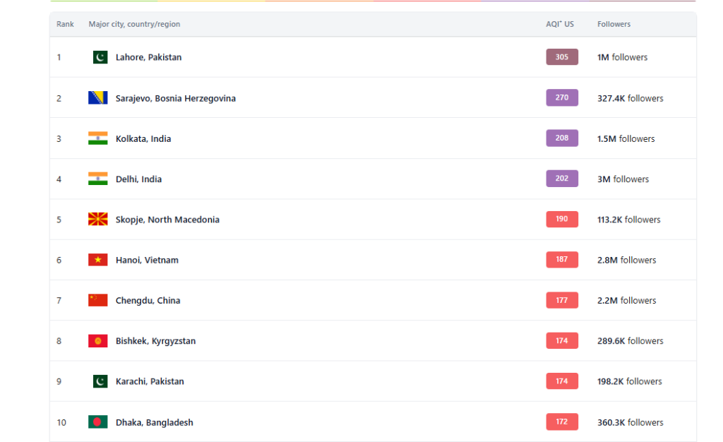 Листата на топ 10 најзагадени градови ја заокружуваат градови од Кина и Пакистан, што значи дека Скопје по Сараево е најзагаден европски град денеска.