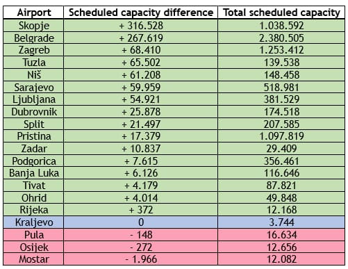 За првиот квартал од 2026 година скопскиот аеродром нуди 316 528 повеќе седишта споредено со истиот квартал од 2025 година, што го прави апсолутен лидер во регионот. Зад Маѓународниот Аеродром Скопје е аеродромот со Белград со 267 илјади повеќе седишта или 100 илјади помалку од Скопје, а далеку зад скопскиот аеродром е аеродромот во Загреб со само 68 илјади повеќе понудени седишта во првиот квартал во 2026 година.