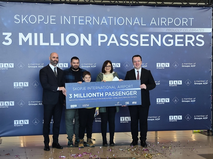 Меѓународниот аеродром Скопје достигна три милиони патници годинава. По тој повод, раководството на аеродромскиот оператор во присуство на вицепремиерот и министер за транспорт Алекснадар Николоски приреди изненадување за три милионитиот патник, Милена Таскова која со семејството патуваше на релацијата Скопје-Бари. Среќната патничка доби бесплатни аеродромски услуги од сестринските компани на ТАВ и два бесплатни билета од Виз Ер по нејзин избор за патување од скопскиот аеродром.