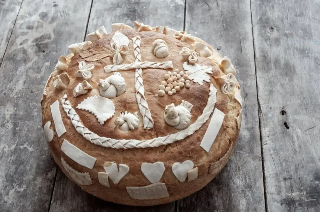 Додека тестото се одмора, измешајте го брашното, згуснувачот, солта и водата, оставете го десет минути, потоа развлечете го со сукало и обликувајте ги декорациите по желба – печат, грозд, класје пченица…