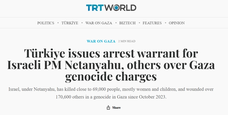Турција издаде налози за апсење за израелскиот премиер Бенјамин Нетанјаху и уште 36 други осомничени поради нивната улога во „геноцид“ во палестинската област Газа, јави ТРТ.