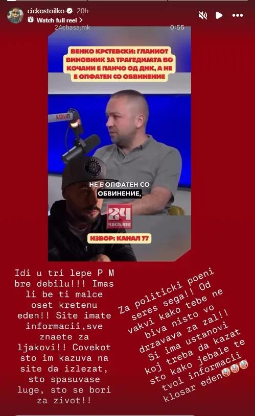 Венко Крстевски вчера на гостување го нападна сега починатиот Панчо од групата ДНК, дека тој како главен виновник ги донел пиротехничките средства во дискотеката и тој ги запалил, а не бил дел од обвинението, ваквото обвинување доаѓа и покрај тоа што речиси сите артисти кои настапуваа таму потврдија дека никој од нив никогаш не носел пиротехника и истата секогаш била обезбедувана од сопствениците на Пулс.