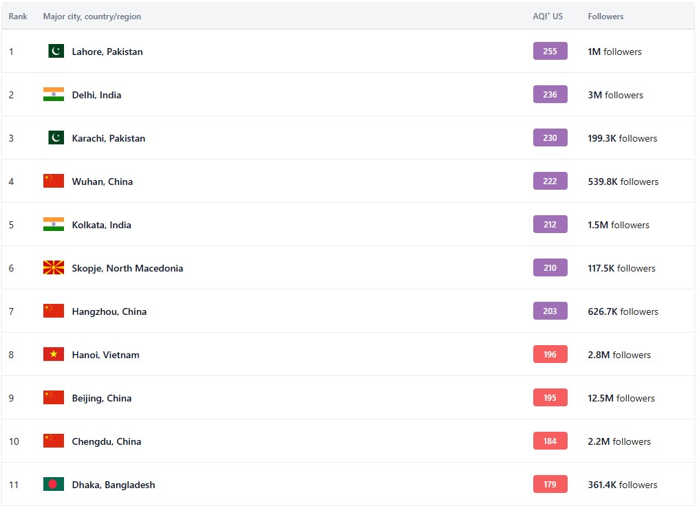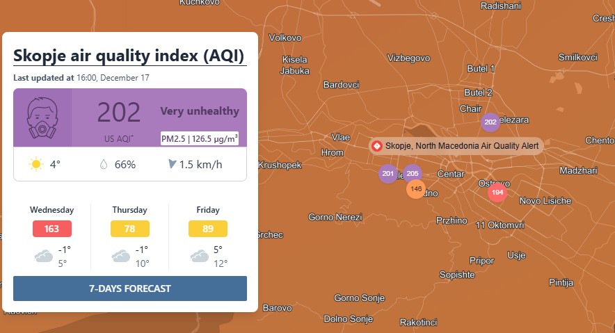 Со индекс од загрижувачки 210, Скопје влезе во таканаречената „виолетова зона“, што означува многу нездрав воздух за сите граѓани. На листата на најзагадени градови се најдоа и Лахор, Пакистан (AQI 255), Делхи, Индија (AQI 236), Карачи, Пакистан (AQI 230), Вухан, Кина (AQI 222) и Колката, Индија (AQI 212).