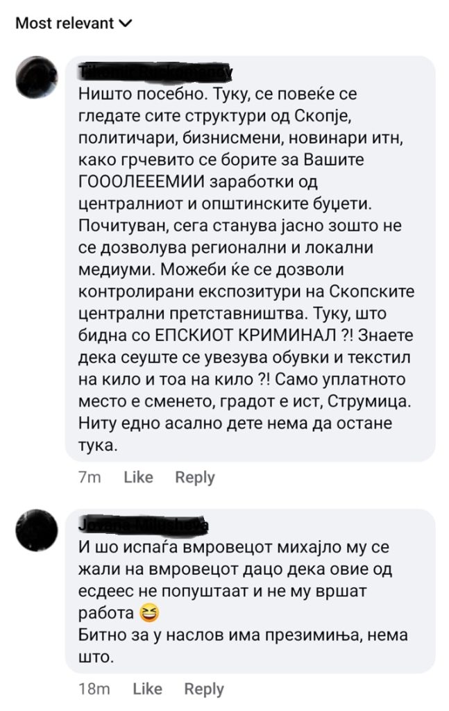 Дека нема никаква поврзаност со тогашн актуелни функционери од власта, укажуваат и бројни коментари на социјалните мрежи објавени токму под таа вест, а кои доаѓаат од лица кои гравитираат околу Штип и Кочани.