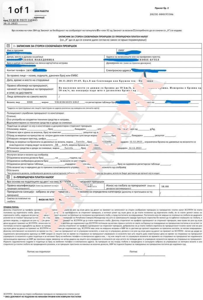Вечерва, редакцијата на 24 Инфо дојде до првата регистрирана казна за брзо возење. Прекршокот е евидентиран на 30.11.2025 година во 19:49 часот на булевар „8 Септември“, во правец кон кружниот тек „Олимпико“. Возилото се движело со измерена брзина од 58 км/час, што е 10 км/час над дозволеното ограничување од 50 км/час за таа локација.
