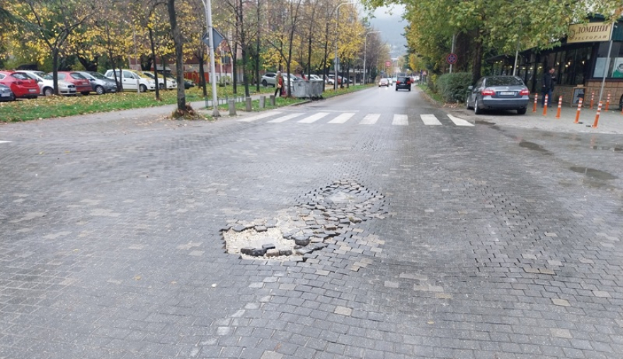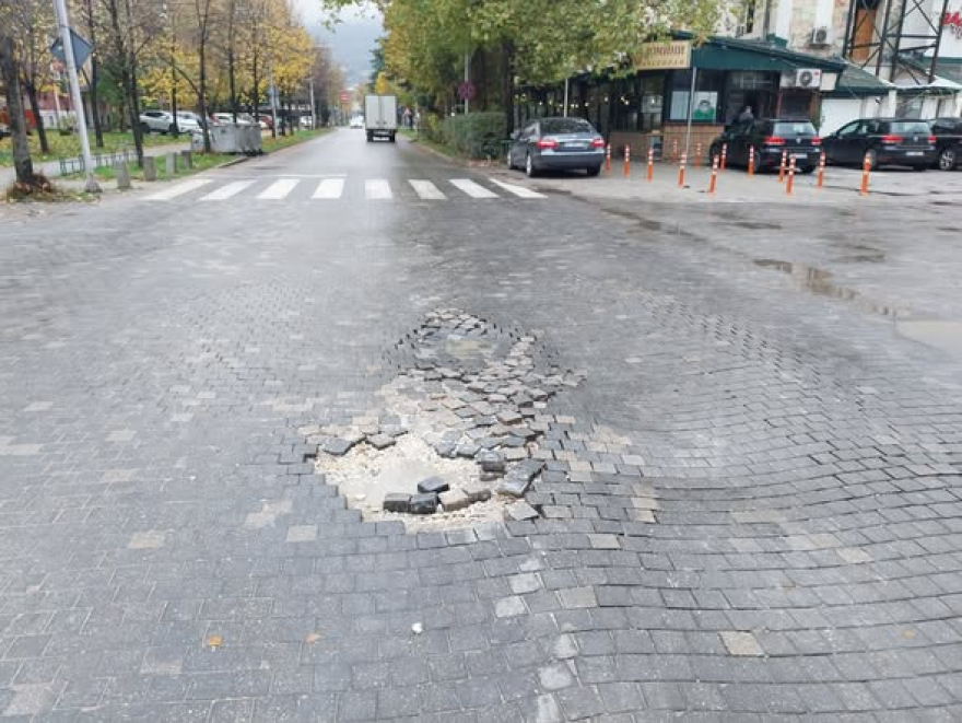 – Веќе подолг период има голема ударна дупка и извадени бекатон коцки кои се расфрални наоколу и е голема опасност некое возило да ги отфрли кон пешаците и останати учесници во сообраќајот. Овој проблем е веќе децениски уште откако се направија оваа и подолу раскрсницата кај ОУ 11-ти Октомври со вакви коцки, предупредува овој граѓанин.