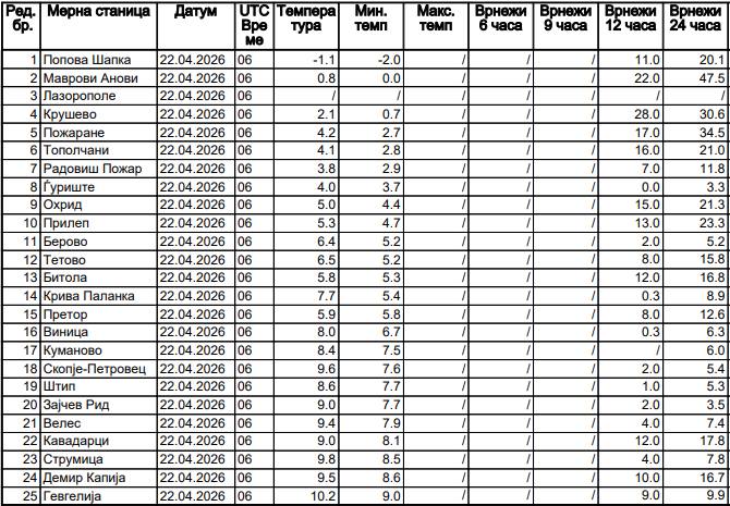 На табелата која утрово ја објави УХМР можете да ги видите измерените минимални температури за денес по градови и места во Македонија до 8 часот утрово како и наврнатото количество на воден талог во литри на метар квадратен исто така до 8 часот утрово и тоа на мерните станици на УХМР.